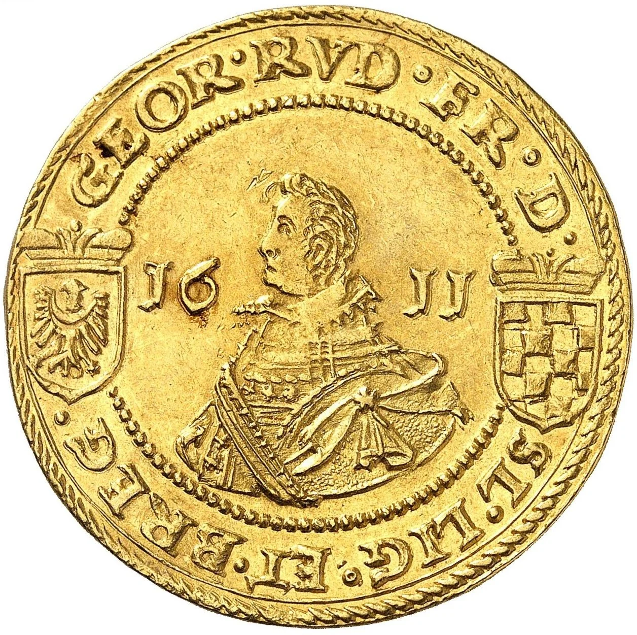 Georg Rudolf bust left divides date, legend upper left, flanked by two small shields.
