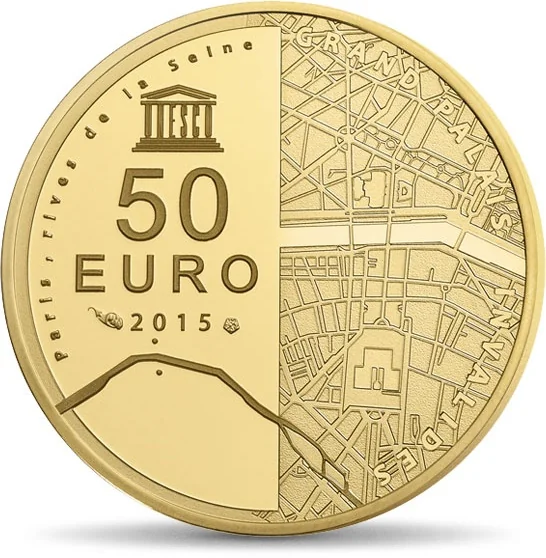 Right: Paris map marking the Invalides and Grand Palais. Left: UNESCO logo, "50 EURO," and the year.