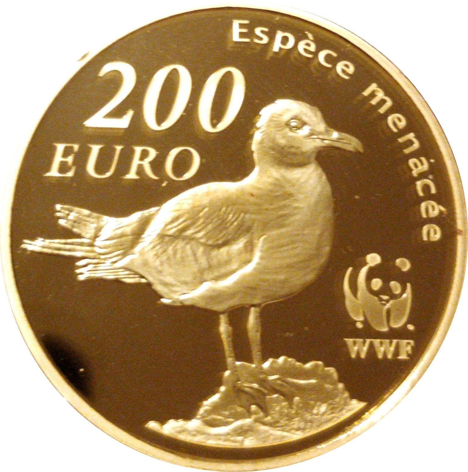 WWF logo with an Audouin's gull, "200 EURO," and "Endangered species."