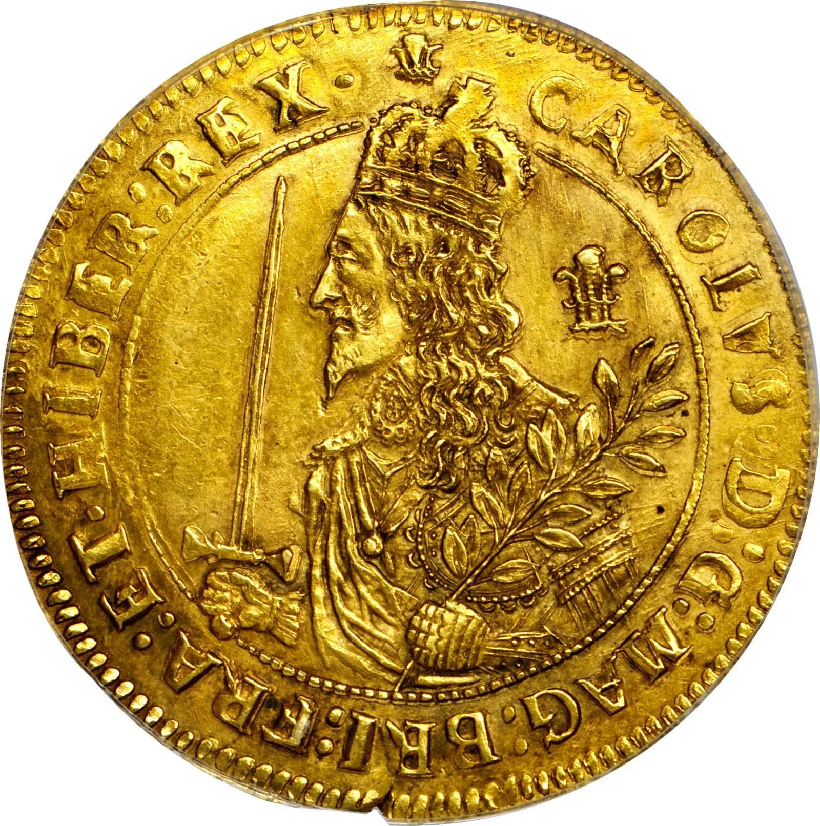 King Charles I crowned and armored, facing left with sword and olive branch, Oxford plume behind. Note: Smaller size; olive branch and bust details vary.