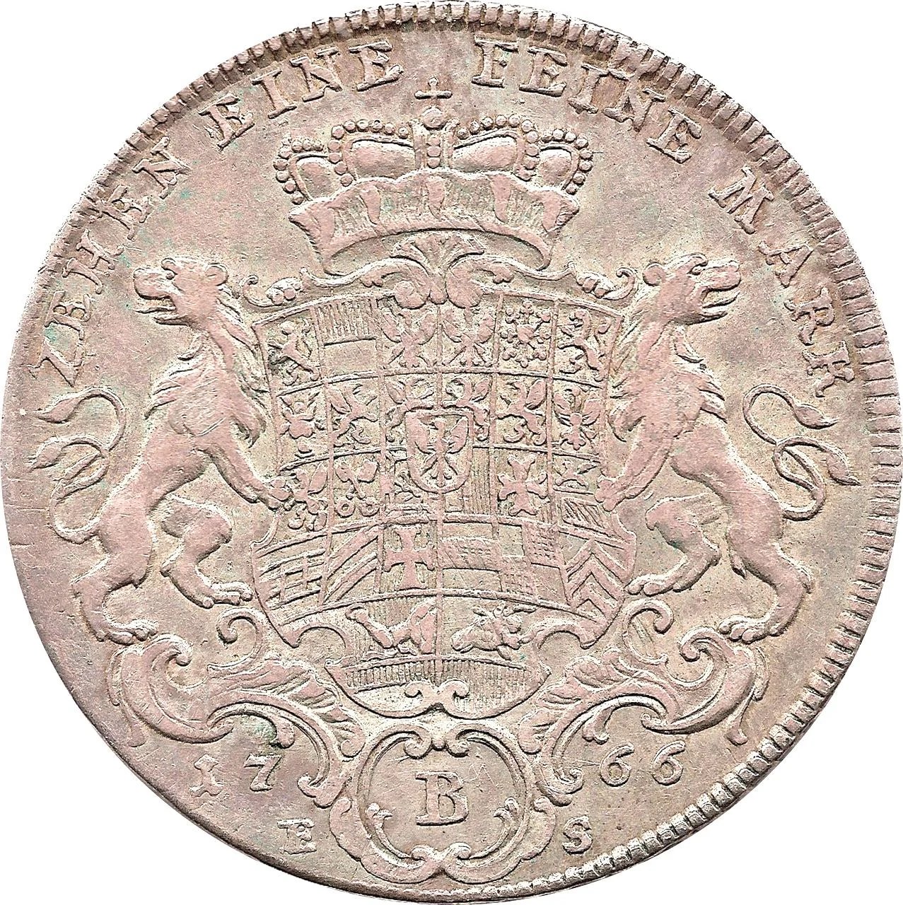 Crowned coat of arms flanked by lions. Value above, vintage, workshop, and master's initials below.