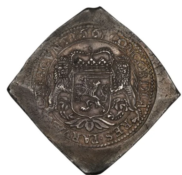 Armored knight on charging horse right above Utrecht arms in ornate frame. Mint mark ends legend.