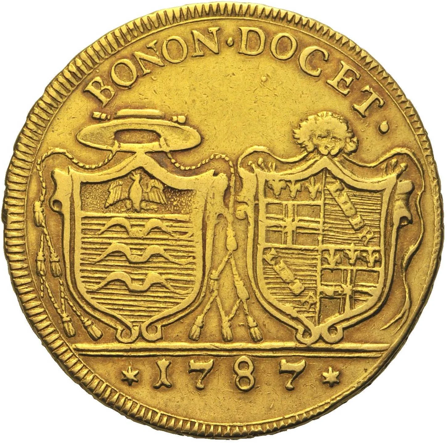 In 1787, Bologna operated within the complex monetary landscape of the Papal States, under the temporal rule of Pope Pius VI. The city did not issue its own independent currency but used a system dominated by the Papal scudo (divided into 100 baiochi, each of 10 quattrini), which was the official standard. However, Bologna's historic economic importance and its position as a major hub meant that a plethora of other coins also circulated freely. These included silver coins from neighbouring Italian states like the Tuscan fiorino and Venetian lira, as well as gold zecchini and Spanish silver reales, reflecting its active role in regional trade.