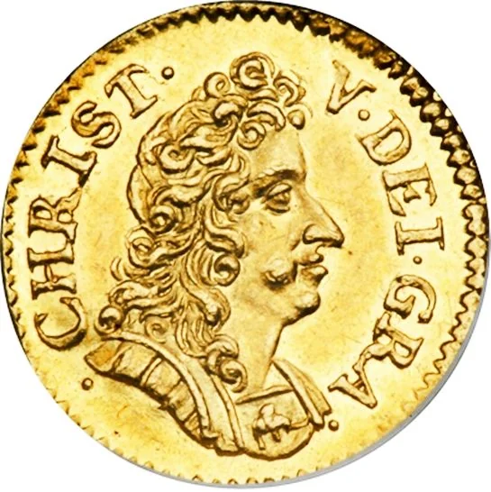 Bust of Christian V with curled hair, facing right. Legend flanking.