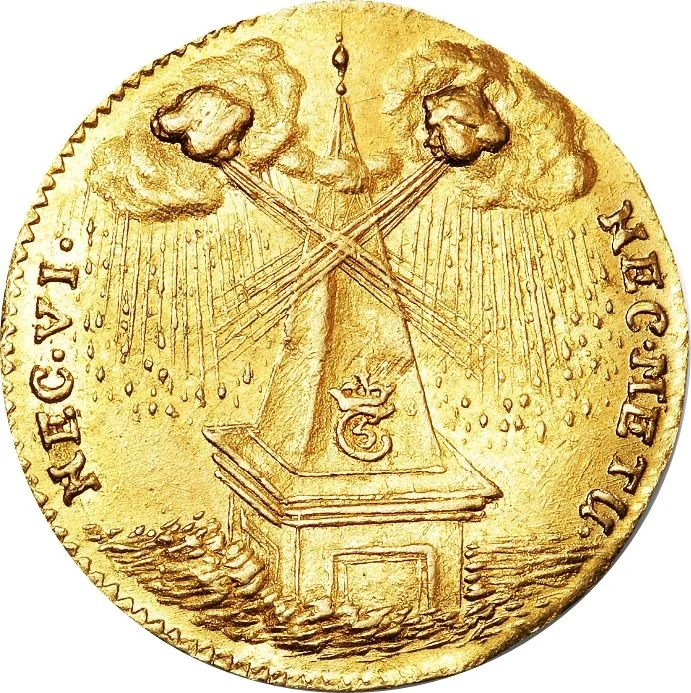 A crowned monogram atop a pyramid rises from a rocky sea pedestal. Two wind-blowing clouds rain down beside its peak. Legend at the sides.