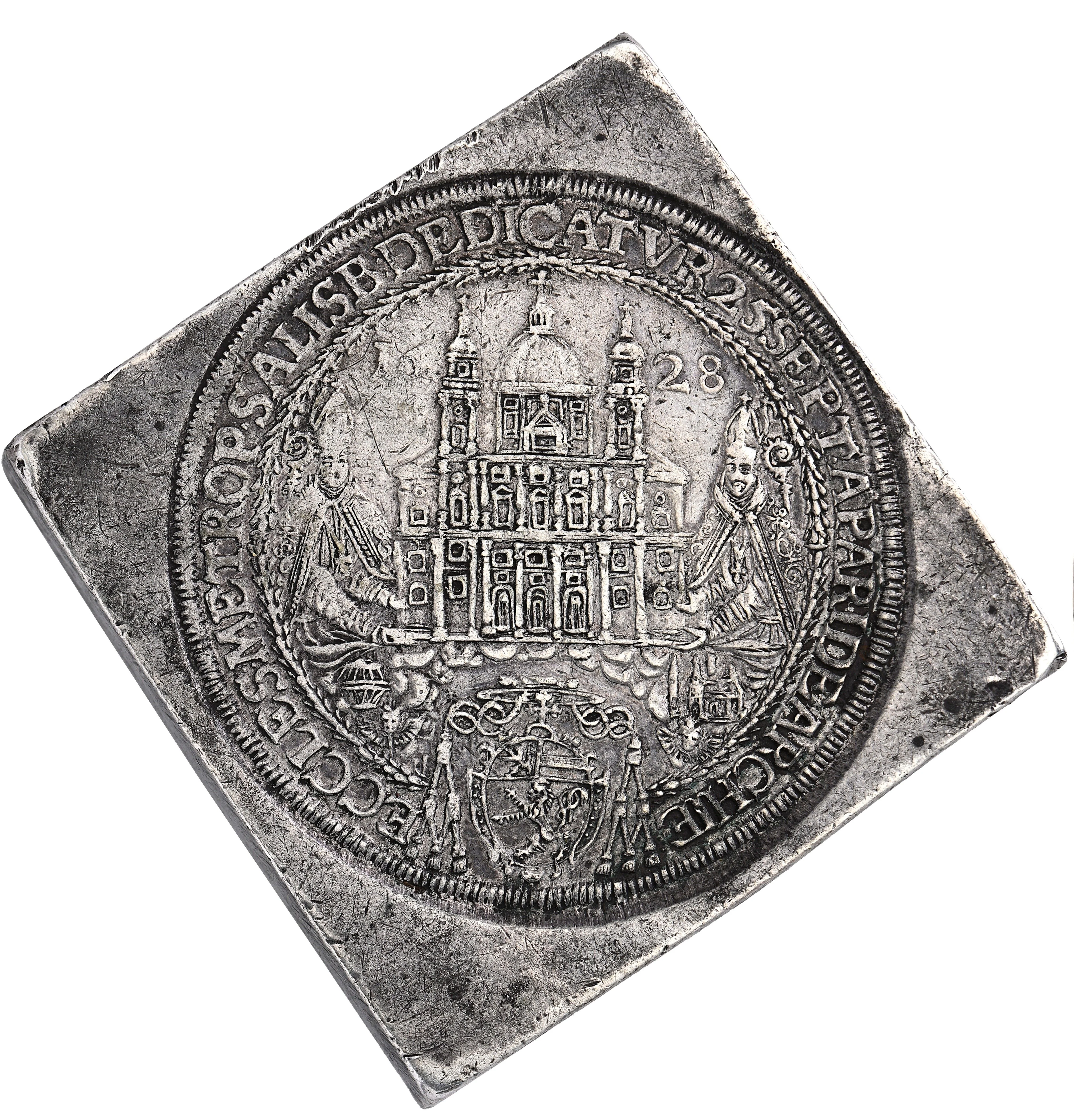 Salzburg Cathedral divides the date, flanked by St. Rupert (left) and St. Virgilius (right). Below, the city's arms separate the surrounding legend.