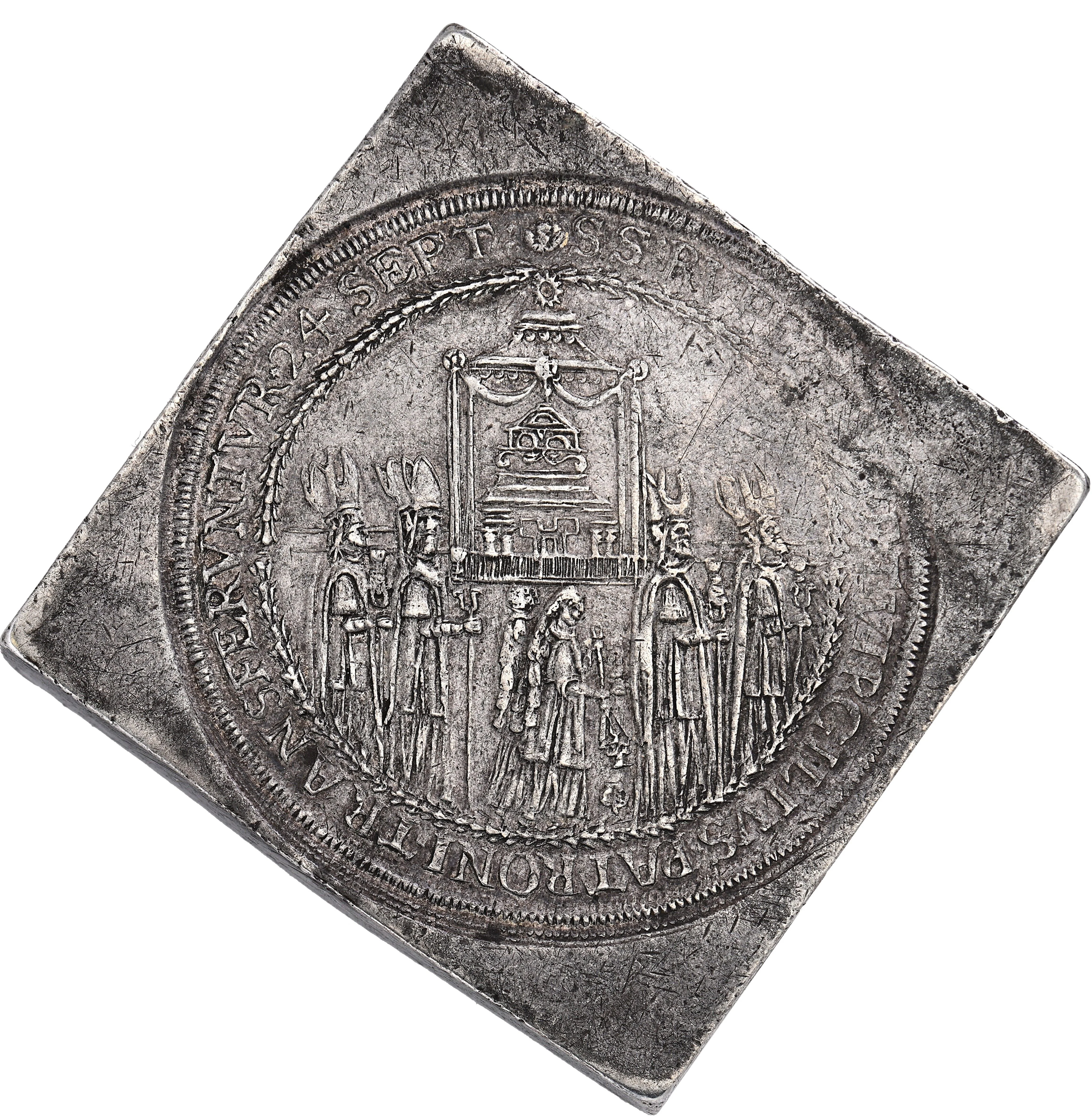 Bishops carrying a reliquary within a beaded circle, transferring the relics of St. Rupert and St. Virgil on 24 September 1628, with a surrounding legend.
