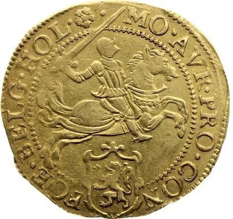 Knight on horseback brandishing sword within beaded circle, with Holland's arms on a shield below. Legend ends with mint mark.