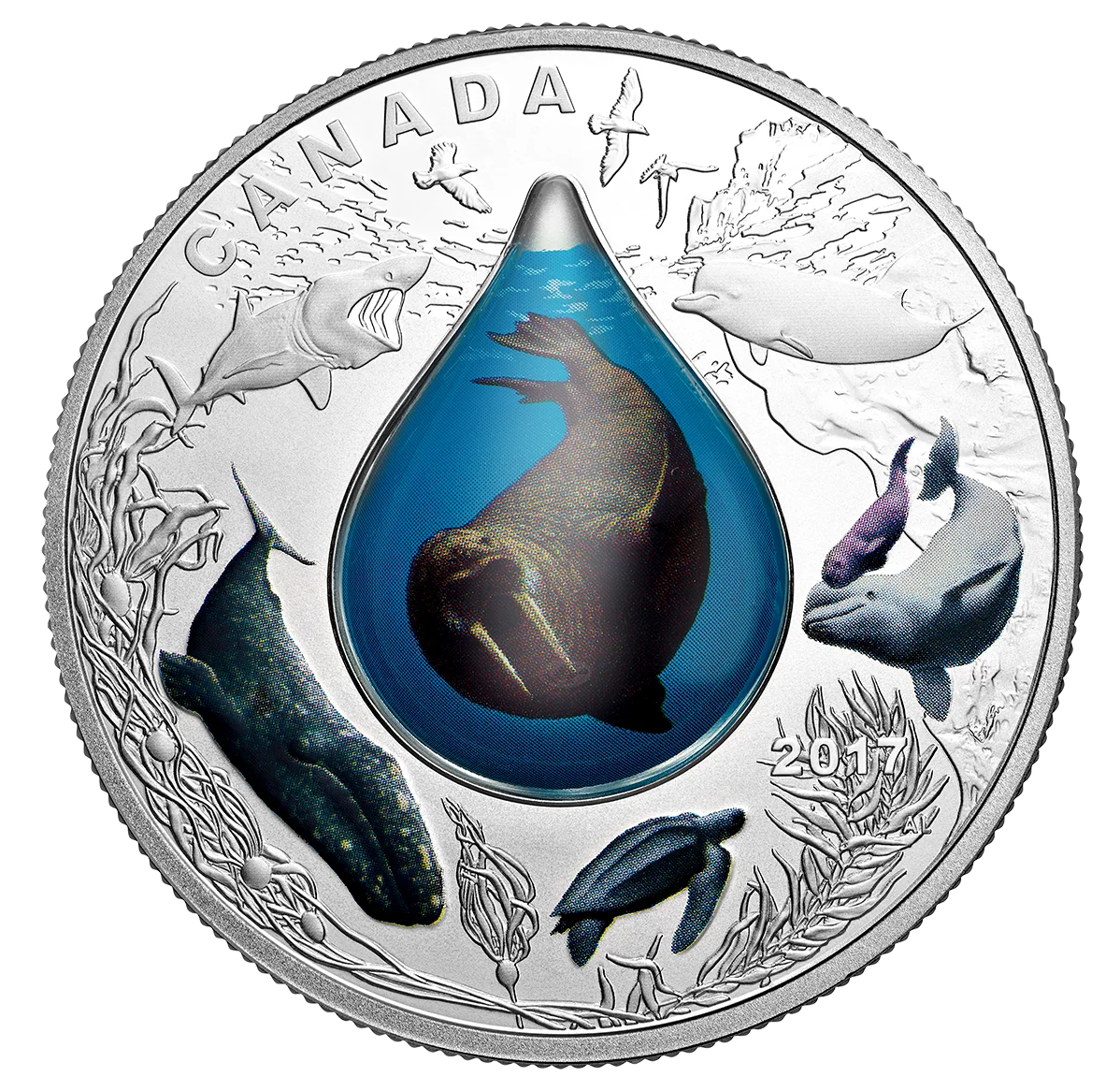 A walrus inside a central 3D droplet, surrounded by an Arctic iceberg, Pacific walruses, ivory gulls, a northern bottlenose whale, belugas, a leatherback turtle, a grey whale, and a basking shark.