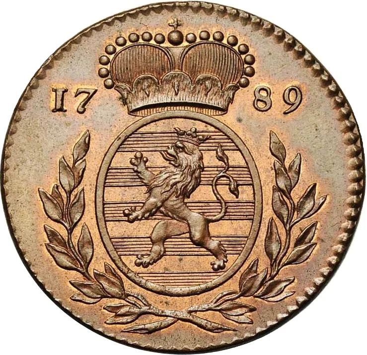 Crowned oval shield with a left-facing, forked-tail lion rampant on a ten-part burlap field, flanked by laurel branches. Mint year above, separated by the crown.