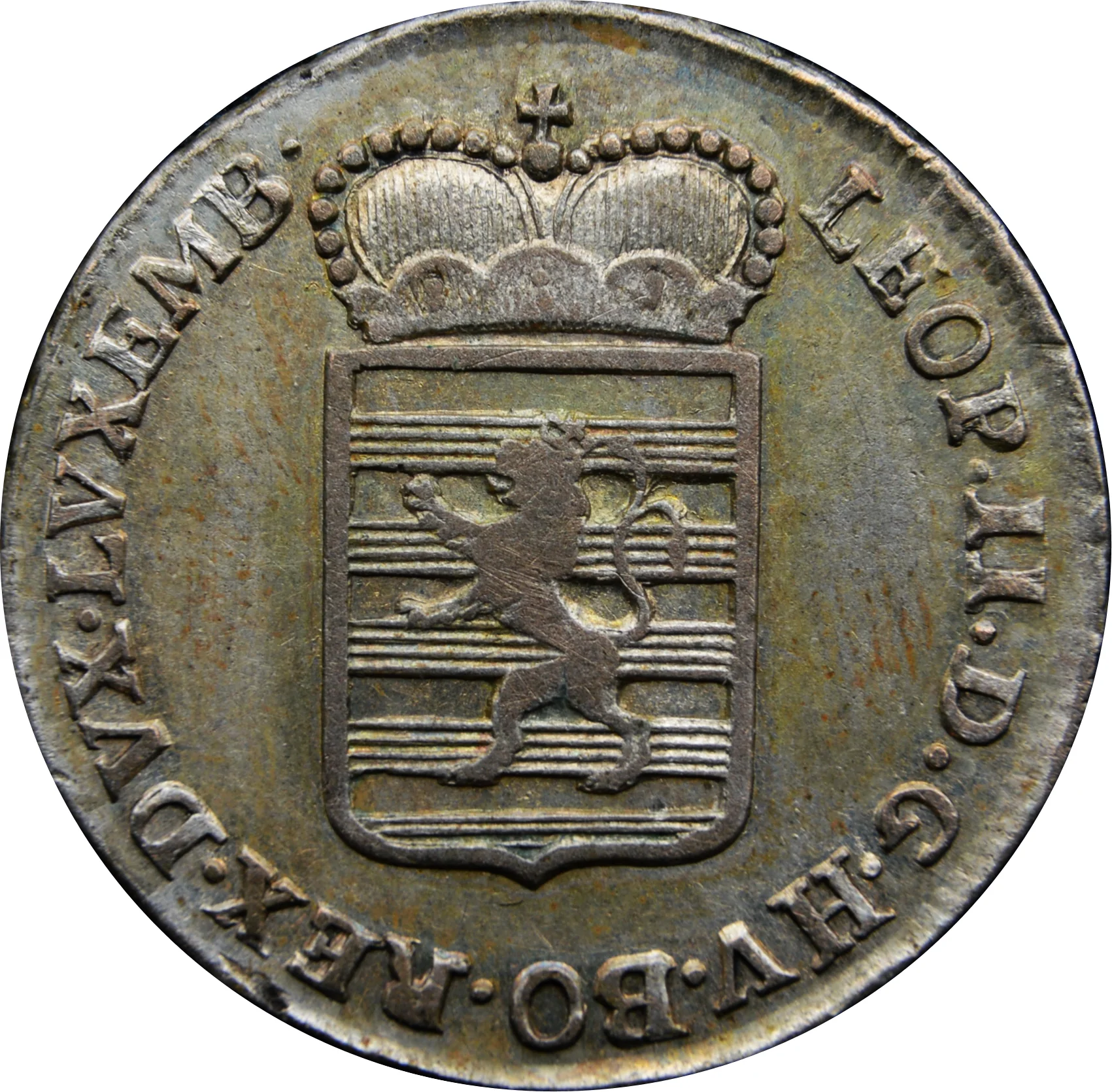 Luxembourg's crowned shield: a forked-tail lion left rampant on ten bars, encircled by legend and border.