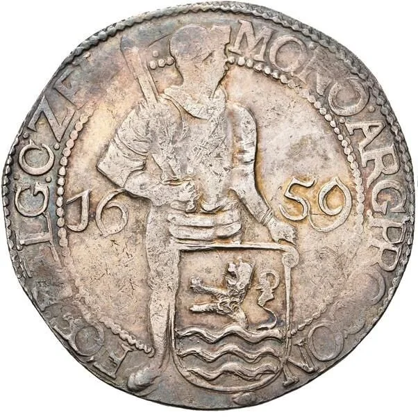 Armored knight standing, sword on shoulder, coat of arms at feet.