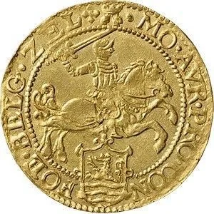 Armored knight on prancing horse, brandishing sword above crowned arms of Zeeland.