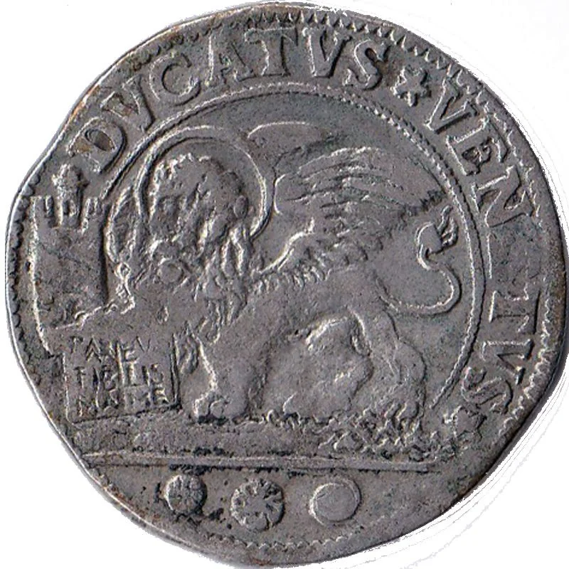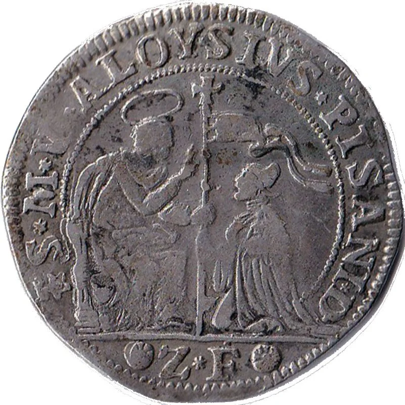 Saint Mark blesses the kneeling Doge Alvise Pisani; both hold a cross-topped standard.