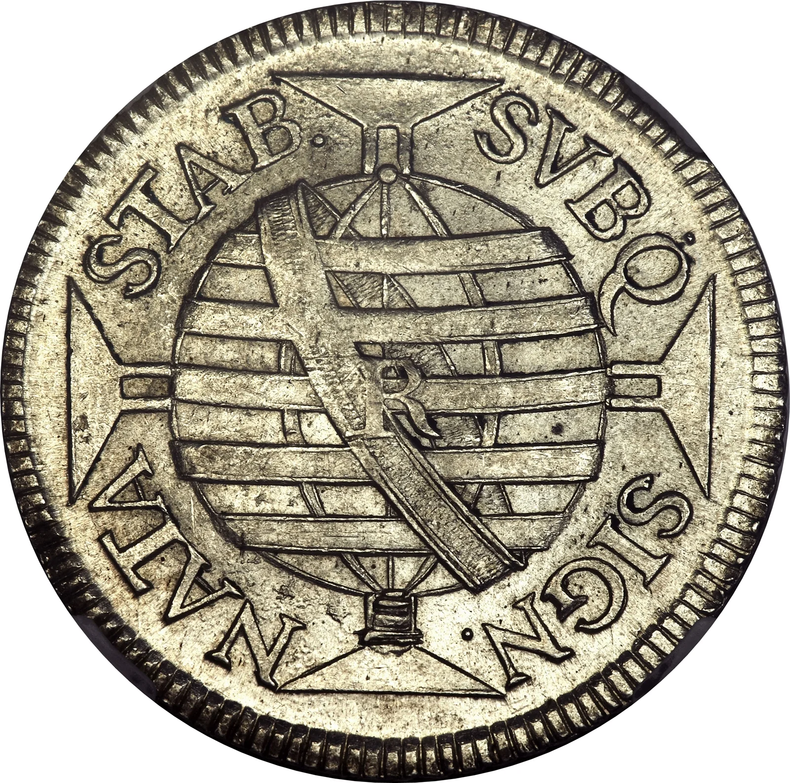 An armillary sphere before the Order of Christ cross, with the R mintmark.