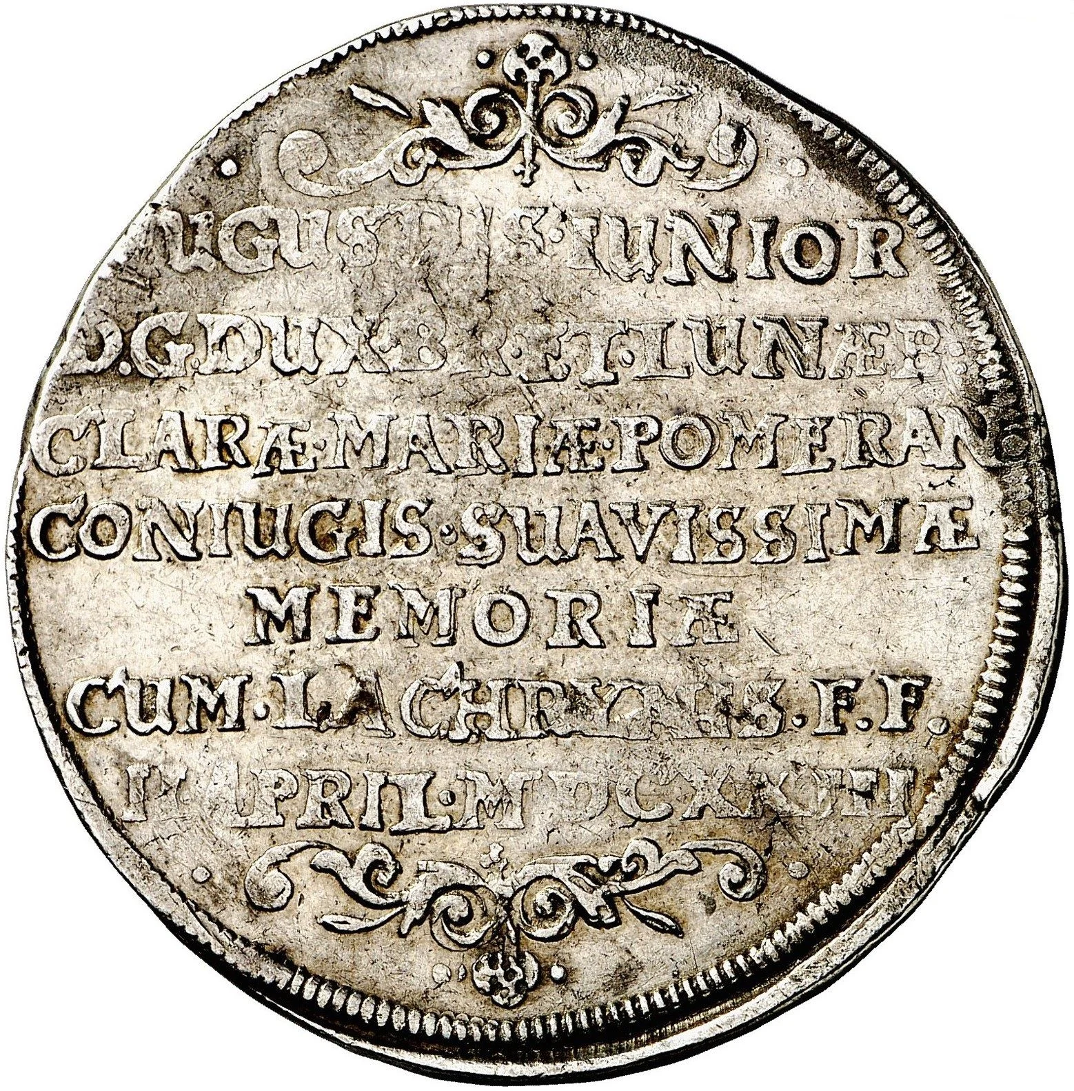 Dated 7-line inscription with baroque scrolls above and below.