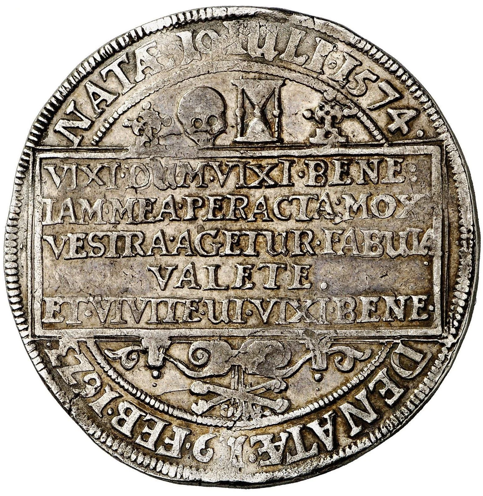 Central panel with 5-line text, skull and hourglass above, dates in legend.