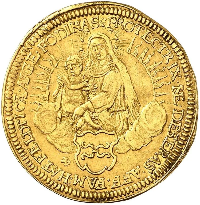 Madonna and Child in radiant clouds, with small Hatzfeld shield below.