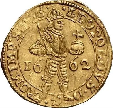 Emperor Leopold I standing, wearing crown and armor, holding a sword on his shoulder and a globus cruciger.