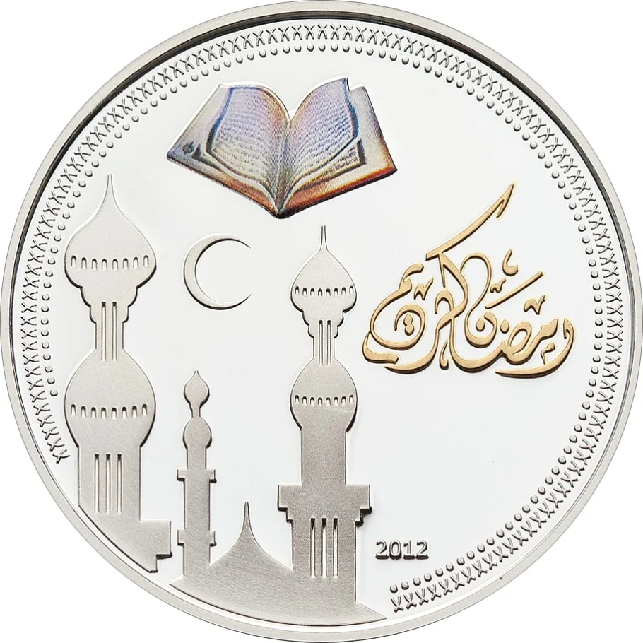 Open Quran over crescent and mosque, with golden Arabic script at right.