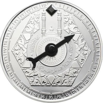A magnetic compass with an outer ring numbered 1–35, an amethyst marking 0/36 above Mecca. Each number equals ten degrees. The inner circle bears the Shahada and a Quranic verse.