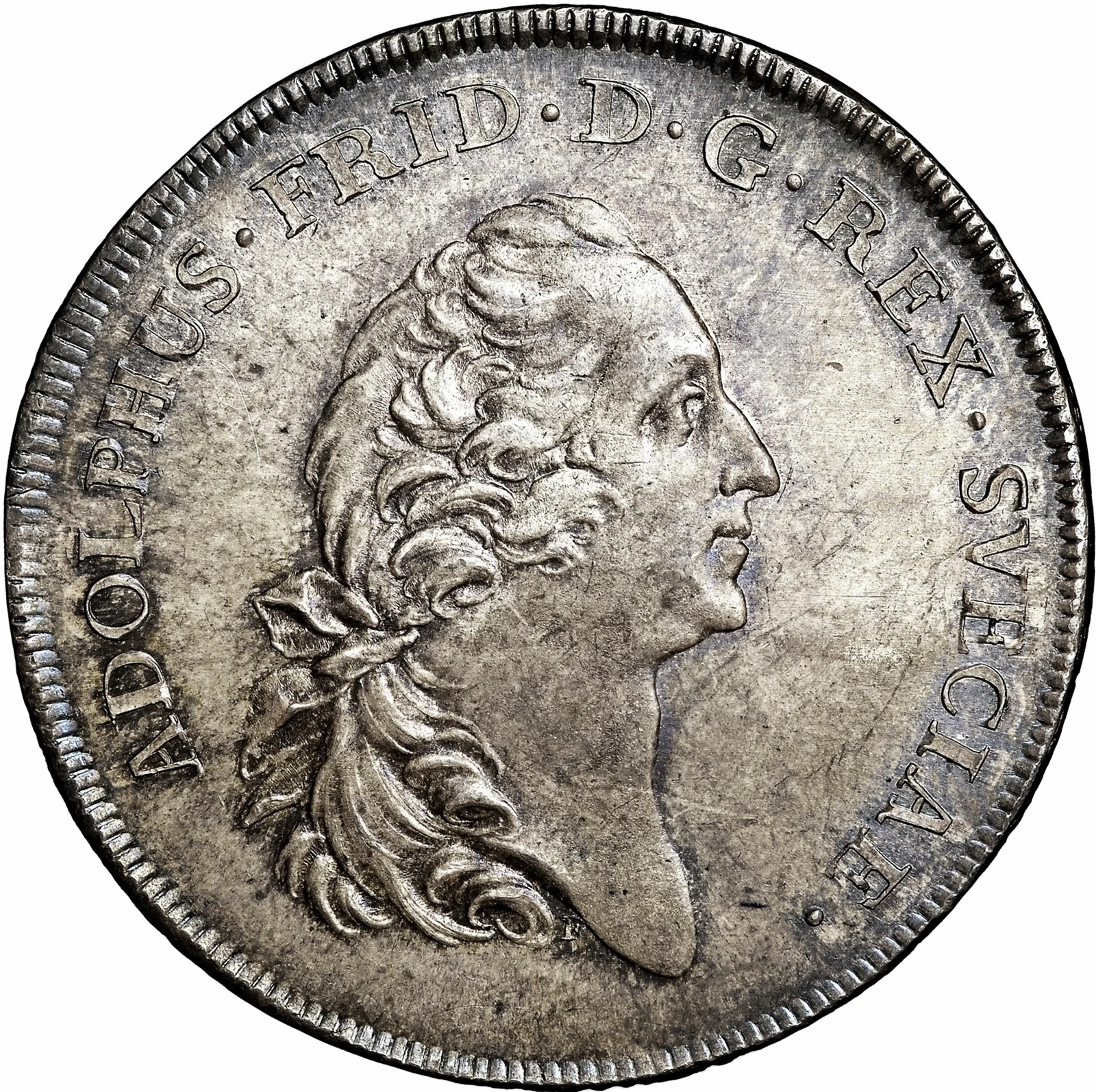 King Adolf Fredrick facing right, long hair, legend around rim.