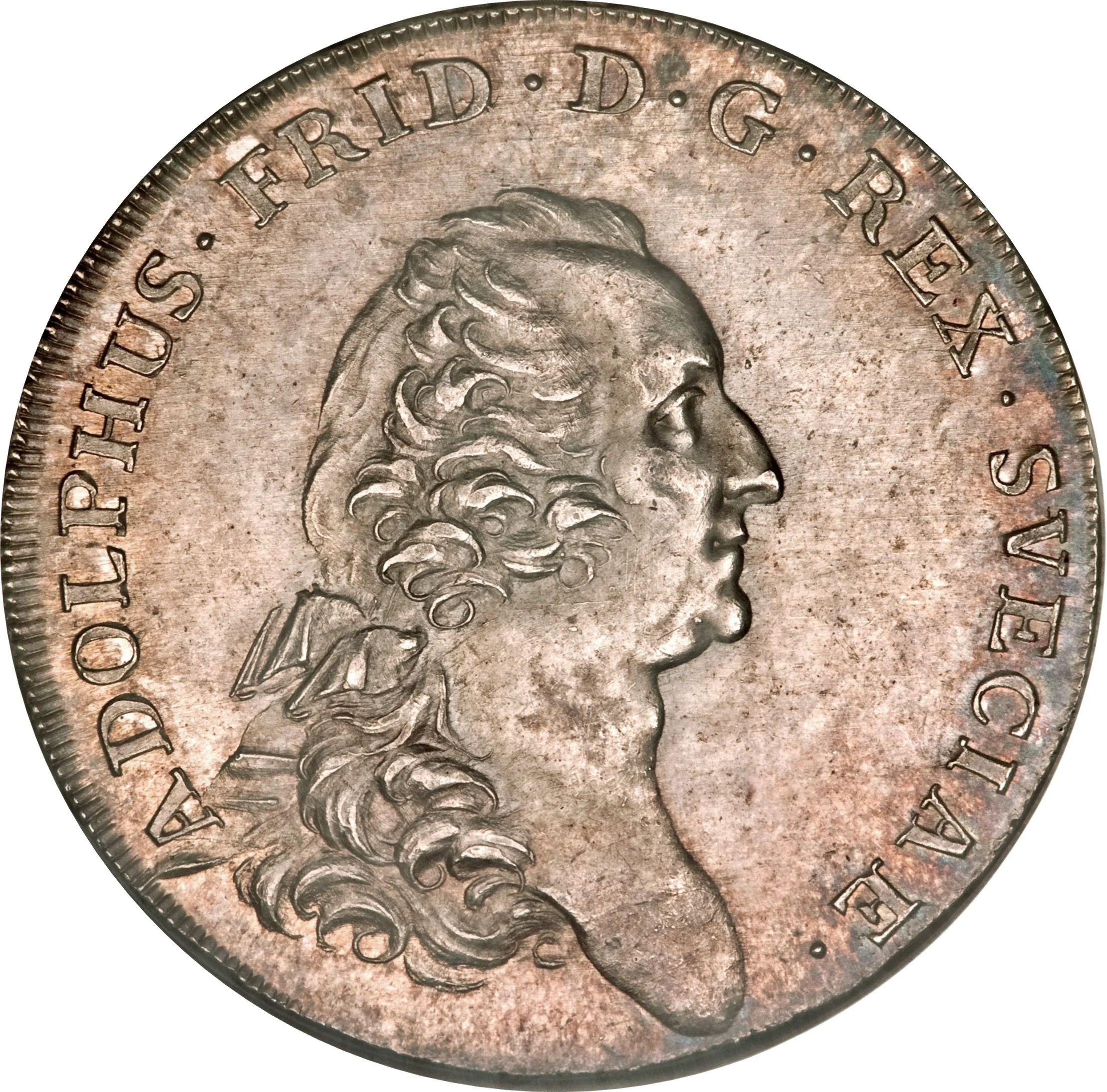 King Adolf Fredrick facing right, long hair, legend around rim.