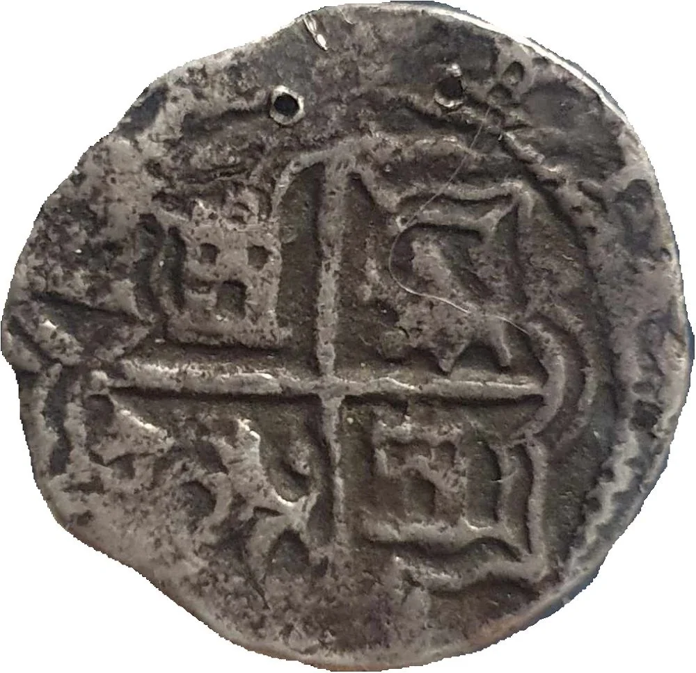 Crowned monogram of Philip II, with mint and assayer marks. Reverse: crowned arms with Potosi mark (P) above assayer initials left, denomination right.