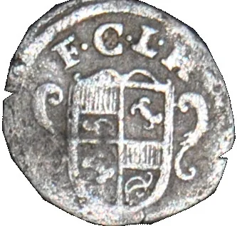 Abbottcoin from Corvey Abbey. Obverse features a shield with the monastery's coat of arms.