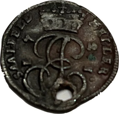 Crowned JE monogram, date sideways, legend divided by crown.