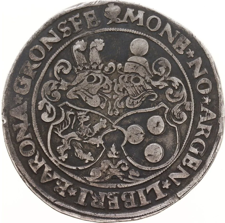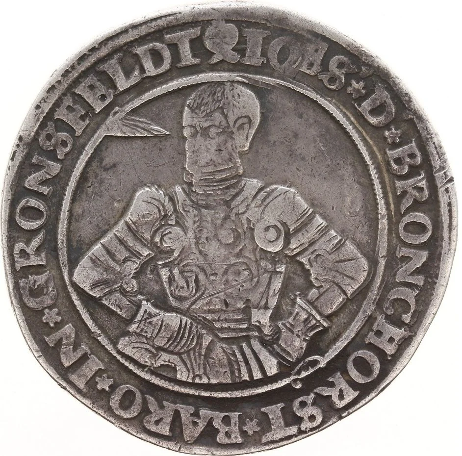 Bronckhorst and Gronsveld coats of arms, tilted inward with plumed helms. Decoration between shields, legend within pearled circles.