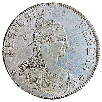 Female bust of Republic in doge's cap and ermine robe, facing right.