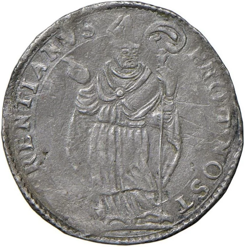 Saint Terenziano, front-facing, blessing with his right hand and holding a pilgrim's staff in his left.