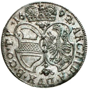 Leopold I of Habsburg facing right within a beaded circle, his head reaching the rim. Value in a cartouche below, legend around.