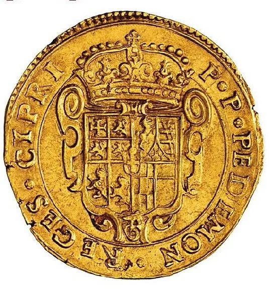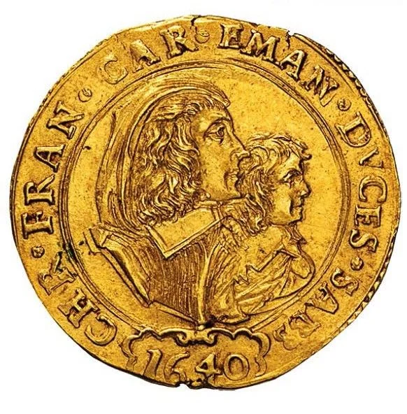 Carlo Emanuele II and his mother facing right, date below in cartouche.