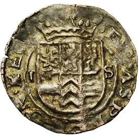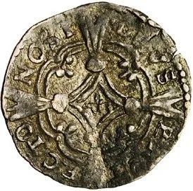 Long cross with voided center, forked tips framing an inner quadrilobe and legend.