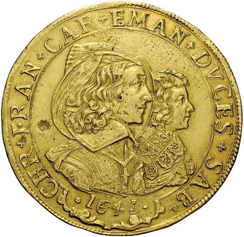 Large crowned shield with many arms, central Savoy shield, in baroque frame.