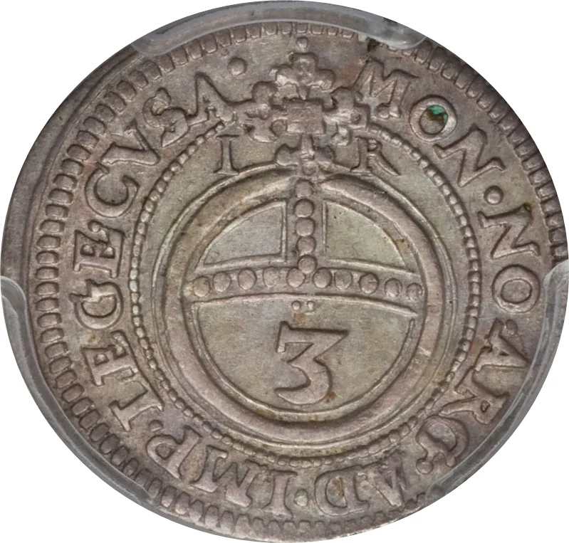 Eagle left with Hohenzollern arms in beaded circle. Legend: "IOACHIM ERNESTUS DEI GRATIA MARGRAVIUS BRANDEBURGII DUX PRUSSIAE BURGRAVIUS NURMBERGII."