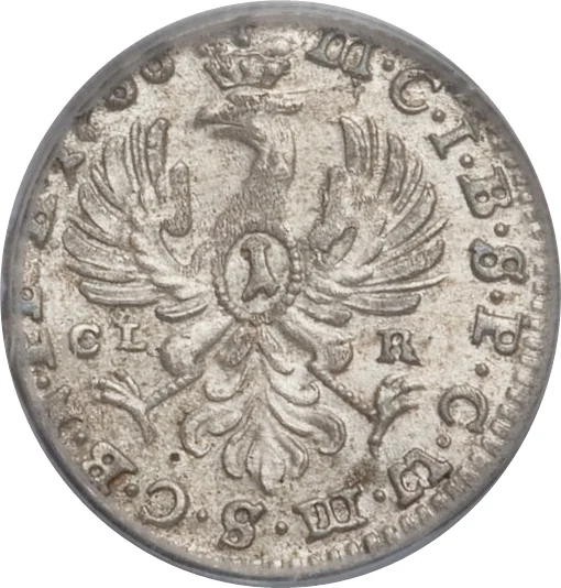 Inscription: M·C·I·B·S·P·C·W·M·S·C·B·N·P·R·H· (Magdeburgi, Cliviae, Juliaci, Bergae, Silesiae, Pomeraniae, Cassubiorum, Wittgensteinensis, Montium Stetini, Crossenensis, Burggravius Norimbergensis, Princeps Halberstadensis)