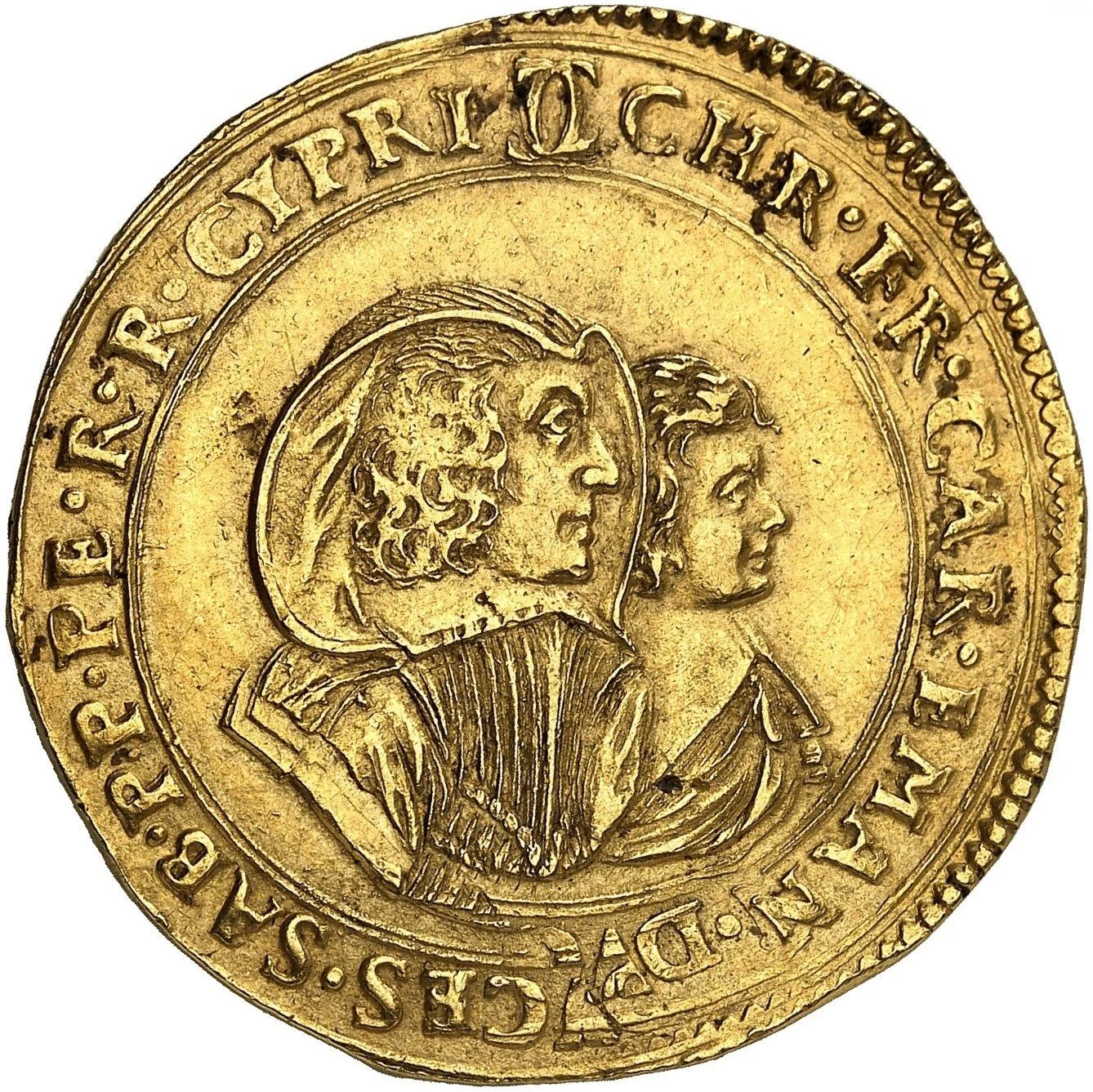 Carlo Emanuele II and his mother in profile to right.