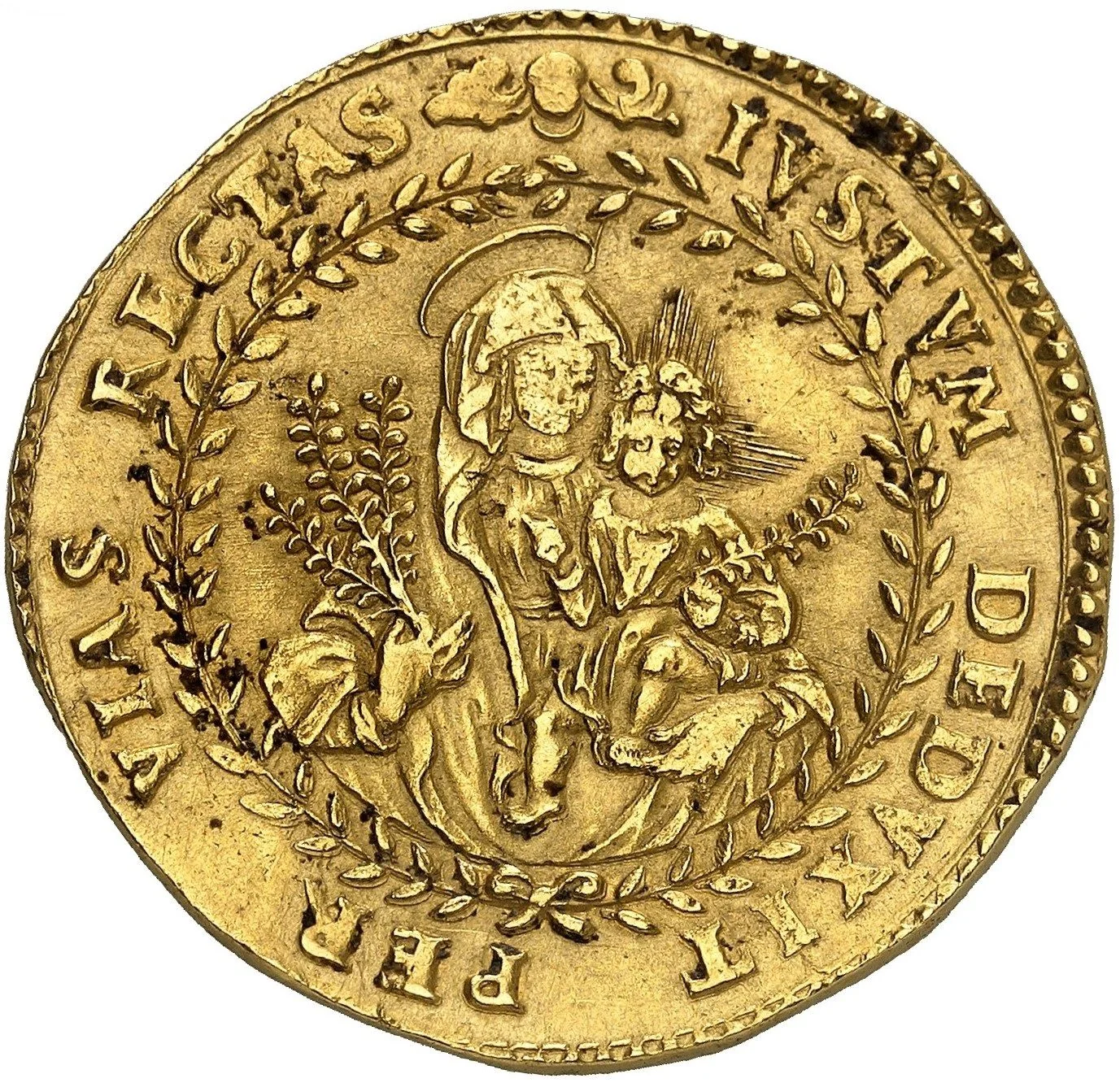 Madonna and Child encircled by laurel.