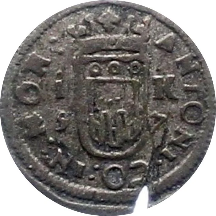 Double-headed eagle with crown, breast shield "1," encircled by legend.