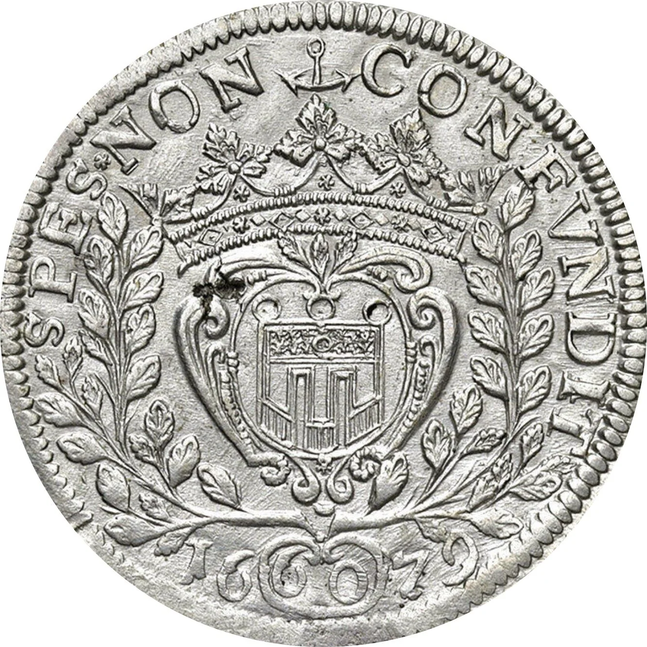 Crowned arms flanked by branches, value below dividing date, legend above.