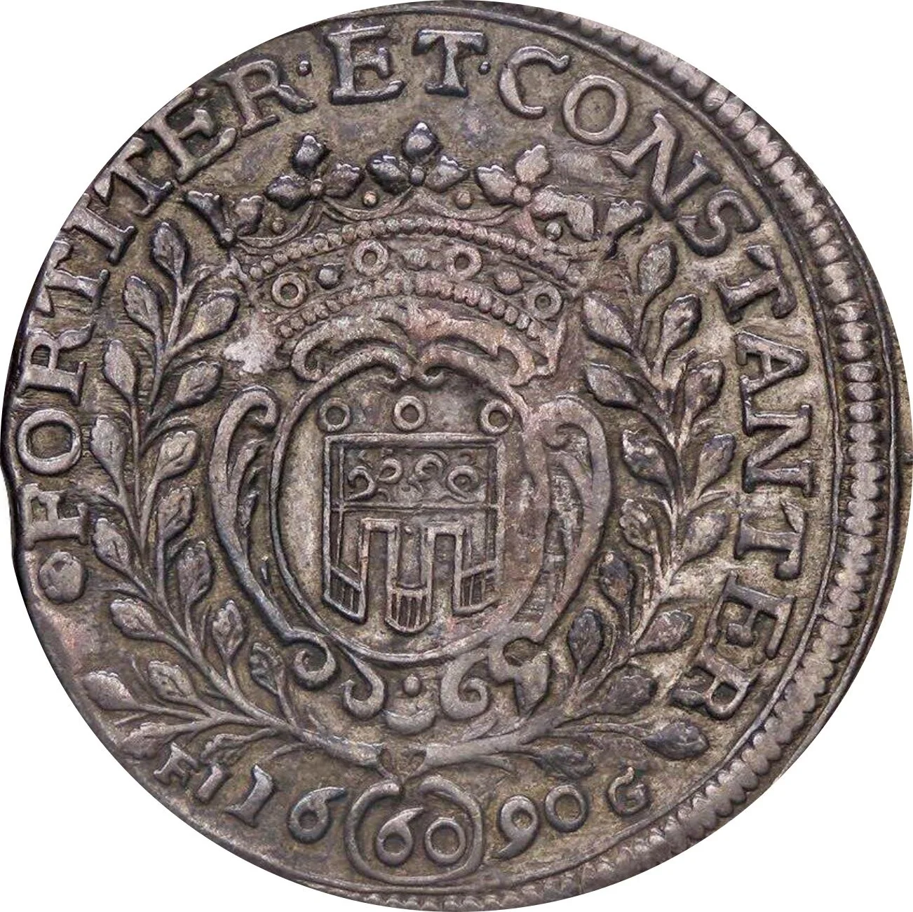 Crowned arms flanked by branches, value below dividing date and mint marks, legend above.