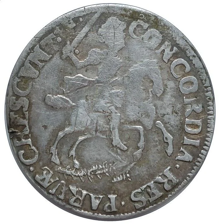 Knight on horseback, sword raised. Privy mark: siren.