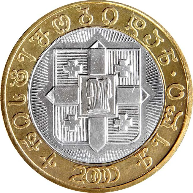 Heraldic shield with crosses and the Sacred Gown of Christ, encircled by a Georgian legend: "2000 A.D."