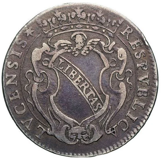 Circular legend with greneti border, crowned shield on a diagonal band in a scrollwork cartouche topped by a cherub.