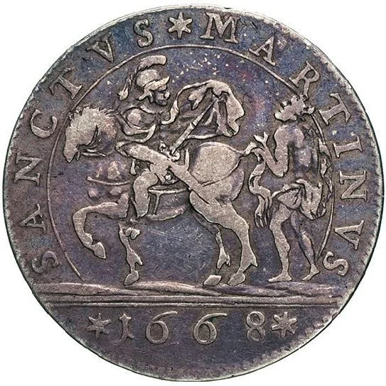 Saint Martin on horseback sharing his cloak with a beggar; date below.