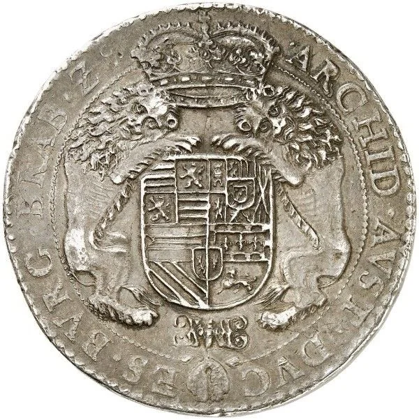 Conjoined busts of Albert and Isabella right, mint mark above date.