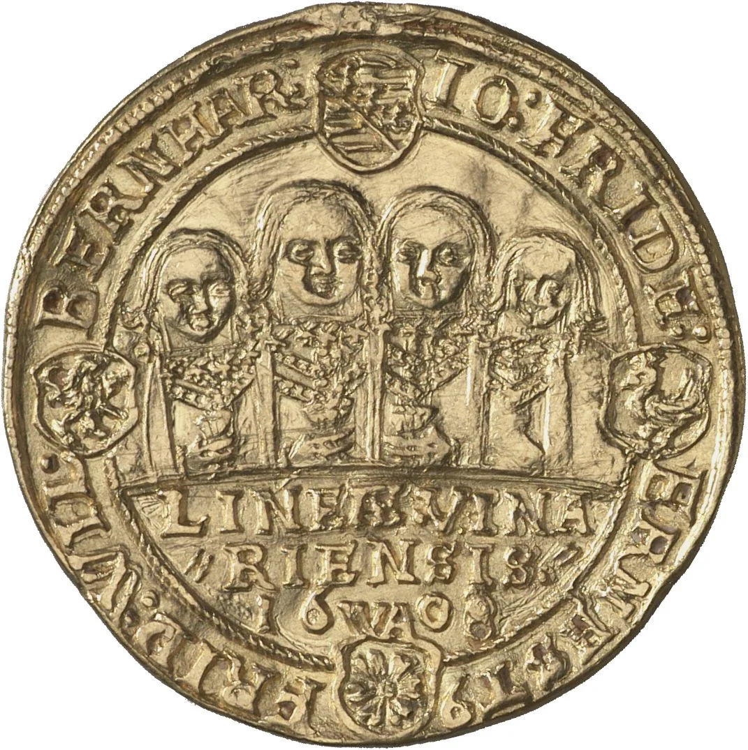 Four facing busts, legend divided by four small shields, three-line exergue inscription.